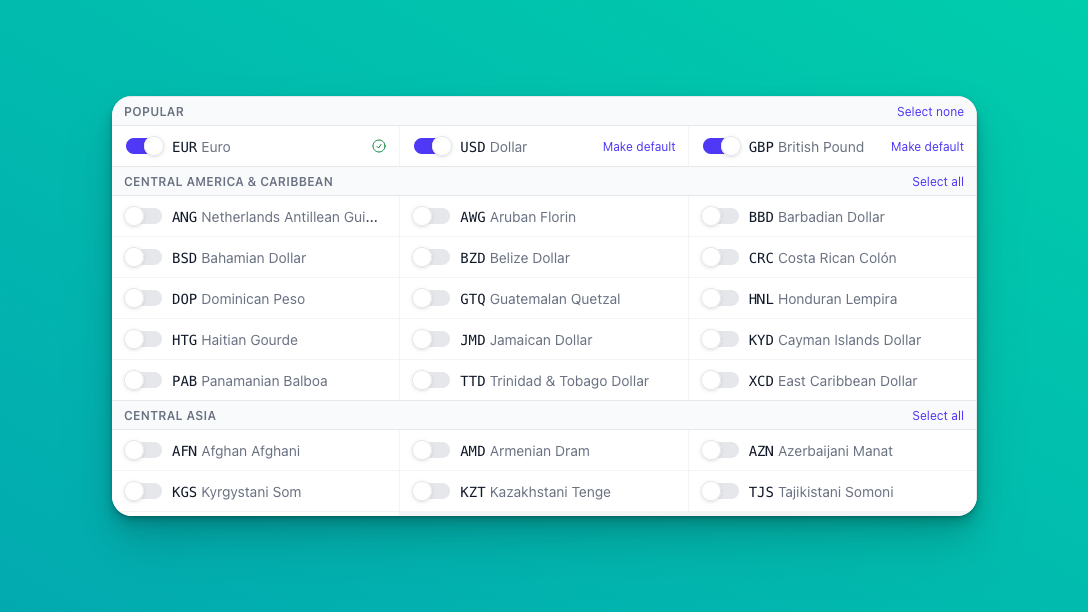You can choose yourself how Moonbase should convert and prettify prices, and for which currencies. We currently support a total of 109 different currencies across all continents, and each one of them can be enabled or disabled for your Moonbase account. Get started today by heading to your account settings and enabling currencies relevant for your markets: